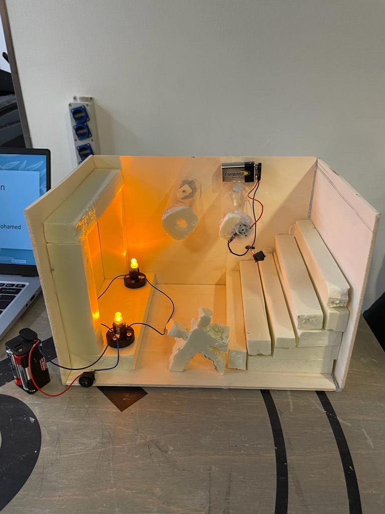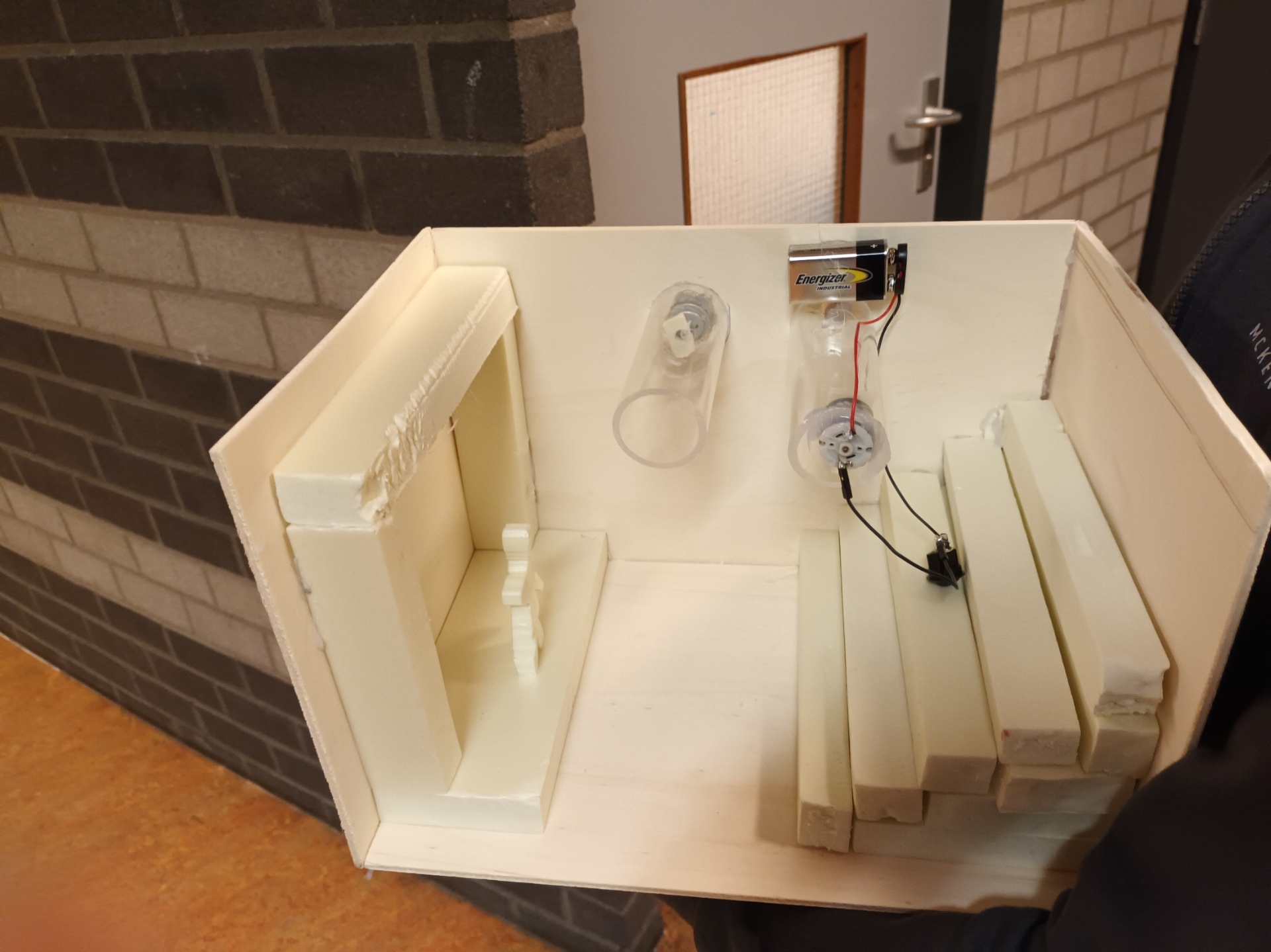 dit is onze prototype van het Drama lokaal we hebben een mannetje op schaal gemaakt om te laten zien hoe groot het Drama lokaal en ons idee echt is we hebben een mooi podium gemaakt en ook de tribune we hebben de ventilatoren met foam gemaakt we hebben het laten draaien met batterijen we hebben ook de lampen zo gemaakt je kan ze aan en uit zetten met een knopje
